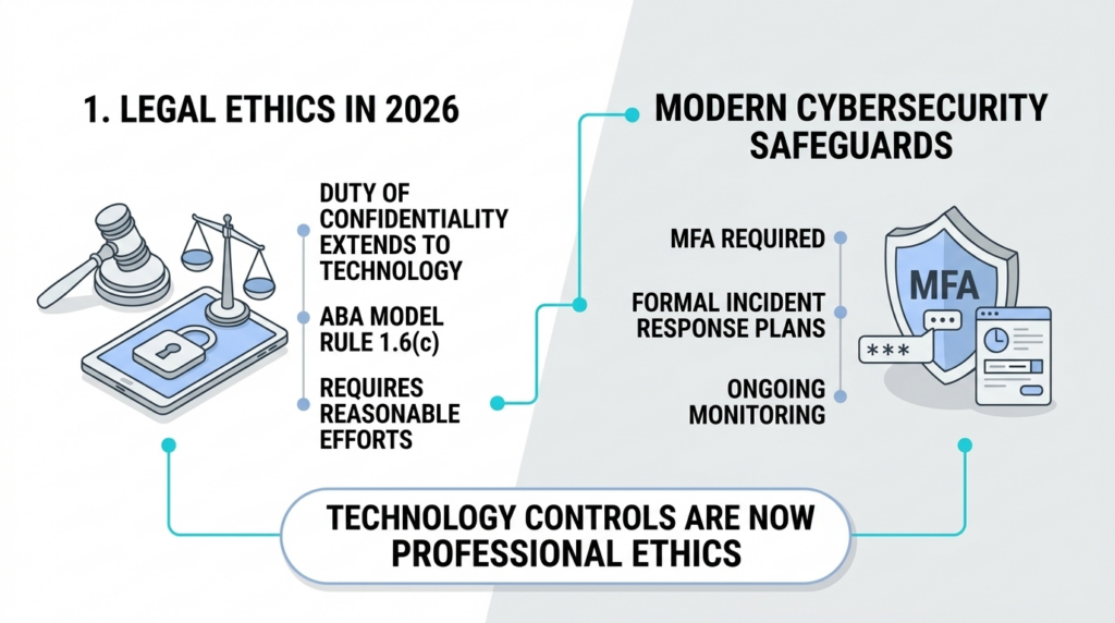 State bar associations increasingly interpret “reasonable efforts” as requiring modern cybersecurity safeguards. Multi-factor authentication. encrypted data systems. monitored access logs. formal incident response plans.