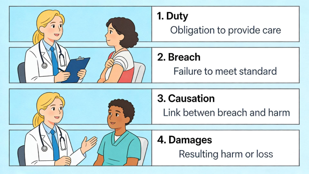 - Duty of Care You must prove a formal doctor-patient relationship exists. Once a physician agrees to treat you, they owe a legal duty to meet the standard of care.