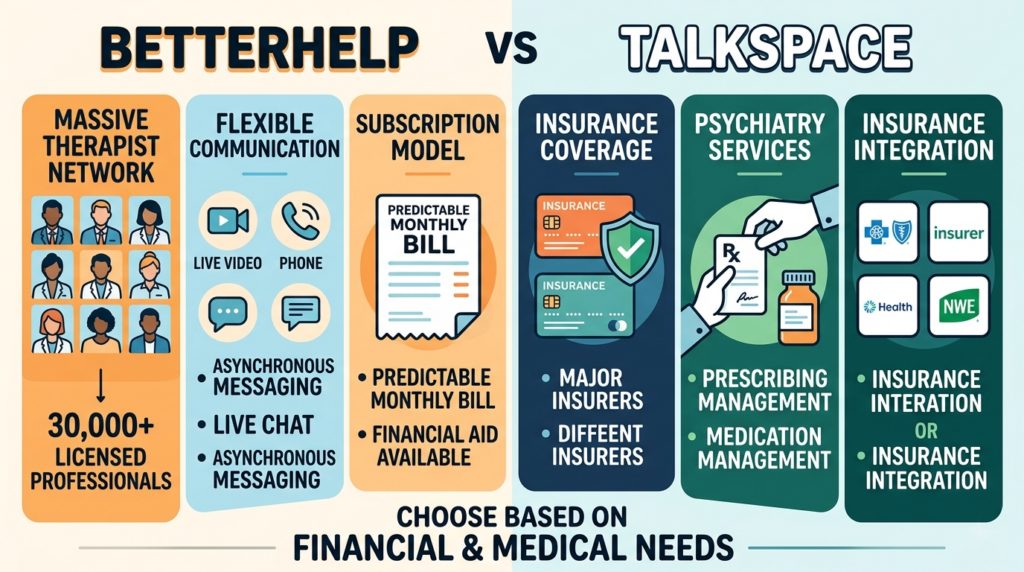 BetterHelp focuses on accessibility and therapist availability. Talkspace prioritizes healthcare system integration and insurance reimbursement.