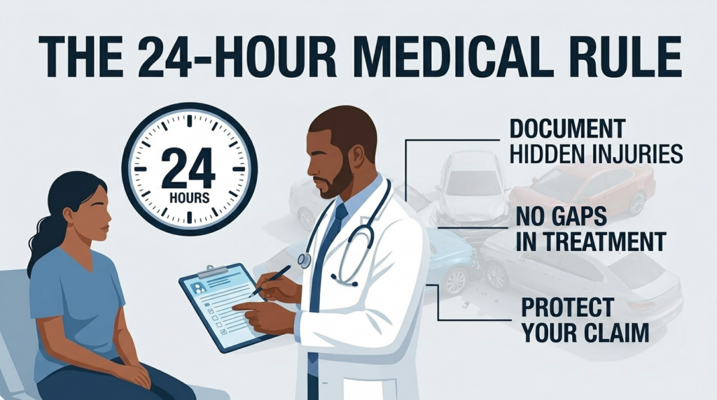 That’s why experienced injury attorneys recommend medical evaluation within 24 hours, even if you feel fine. Emergency rooms or urgent care clinics can document early symptoms and rule out serious trauma.