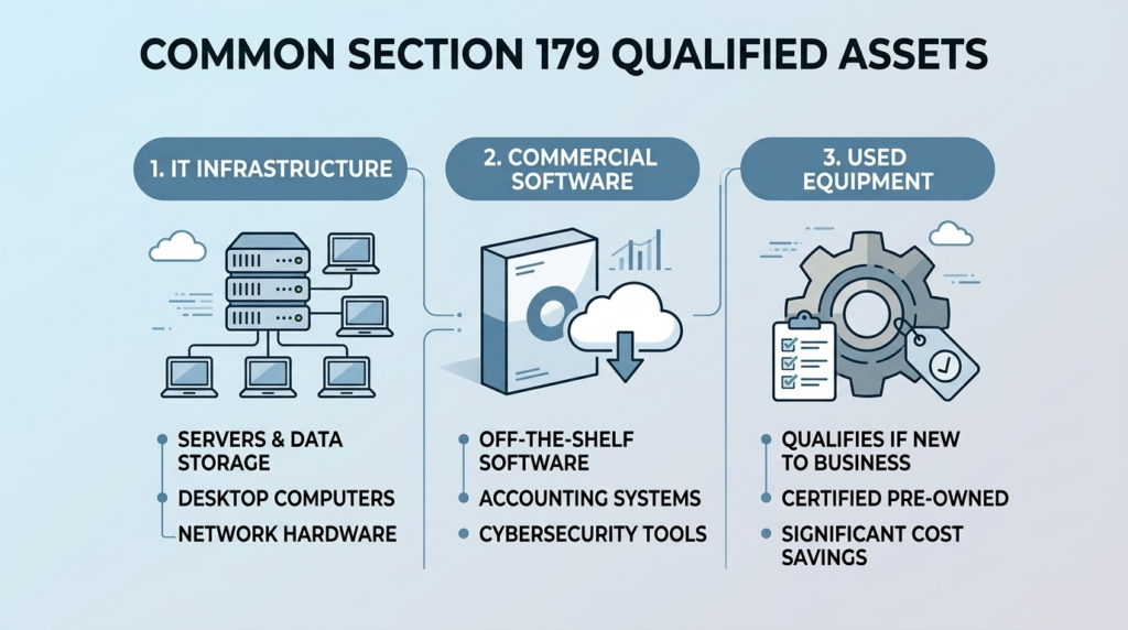 Today’s businesses run on digital infrastructure just as much as physical equipment. The IRS recognizes that, and the list of Section 179 eligible assets is broader than many owners realize.