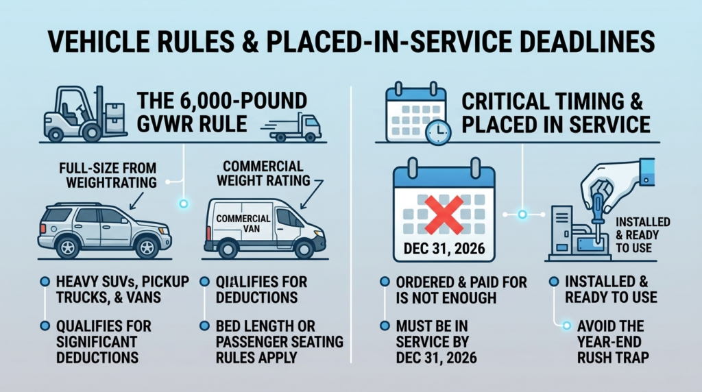 To claim a Section 179 deduction for 2026, the equipment must be placed in service before December 31, 2026.