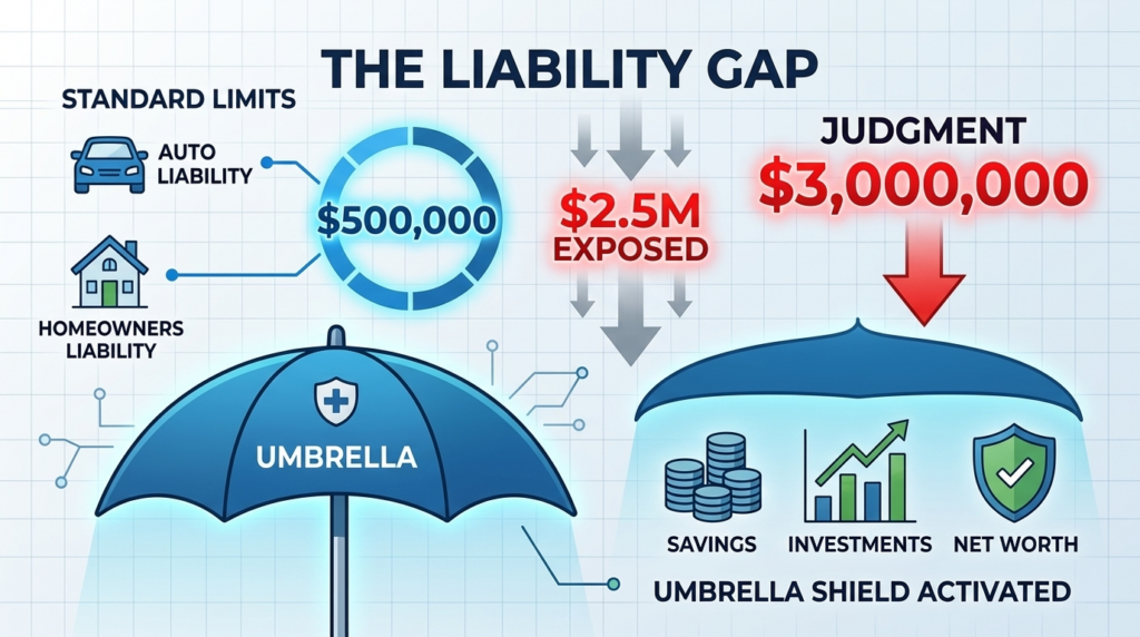 If your policy covers $500,000 and the court awards $3 million, that leaves $2.5 million exposed. Without umbrella insurance, the court can pursue your personal assets to satisfy the judgment.